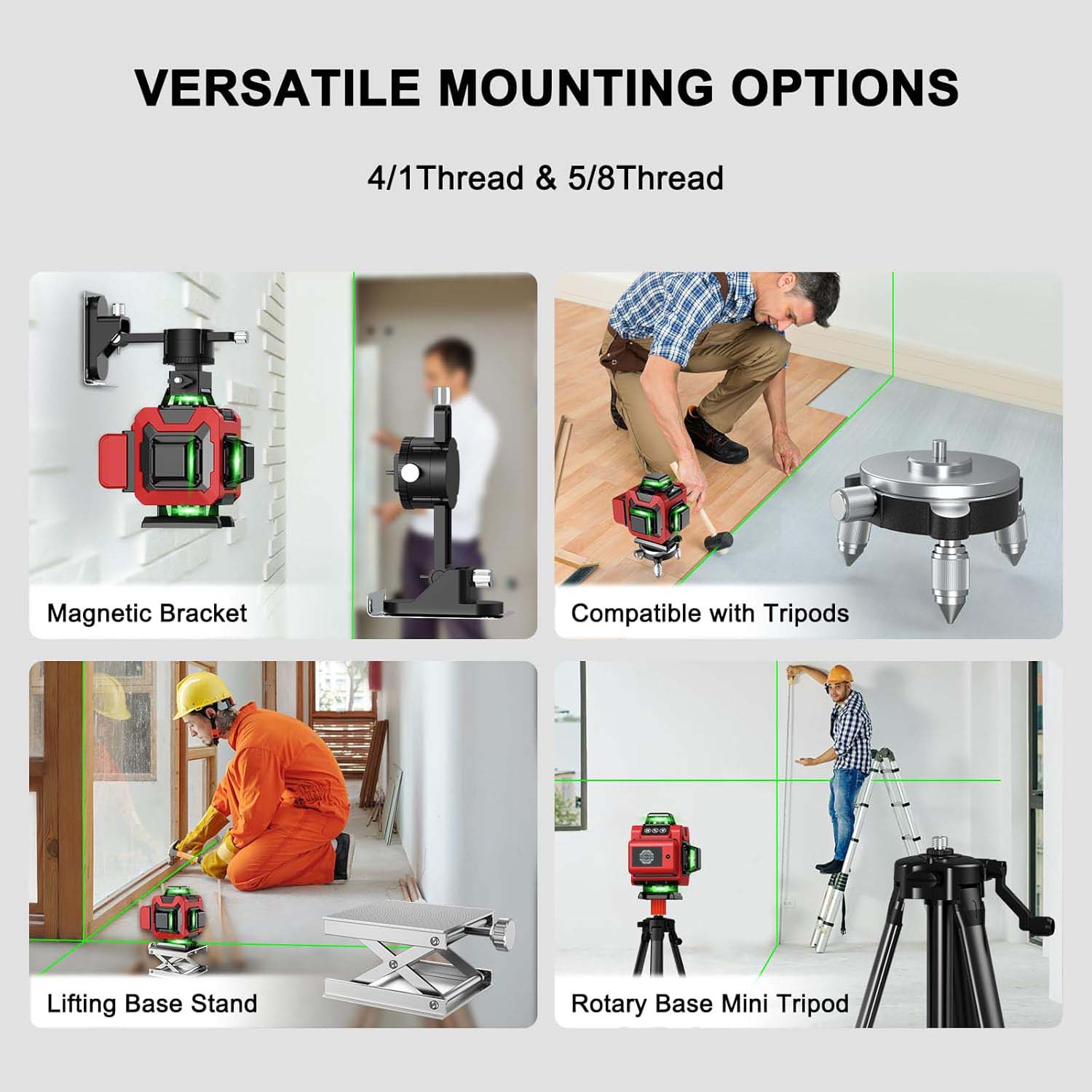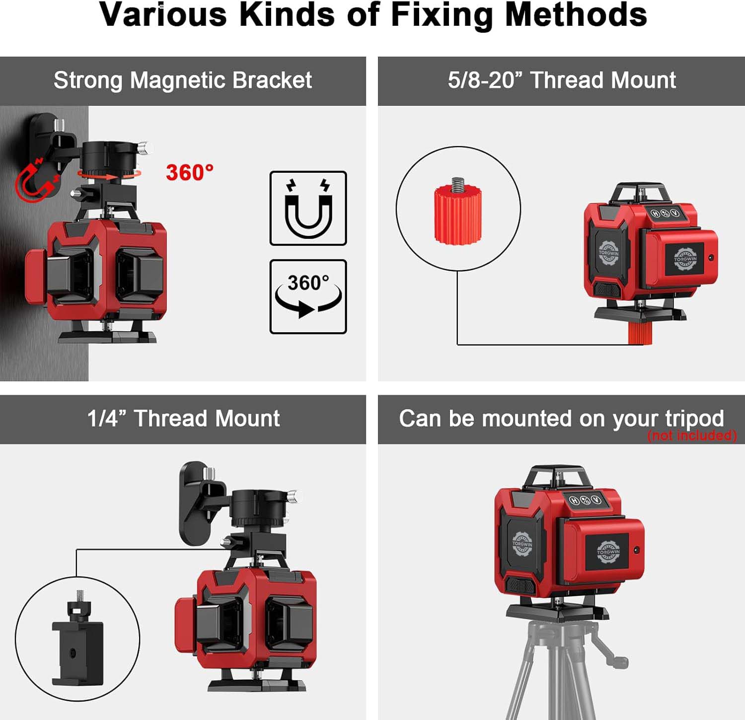 1. Metode diverse de fixare:Este echipat cu un suport magnetic puternic, care oferă o modalitate stabilă și convenabilă de a fixa nivelul laserului în multe situații. Suportul cu filet de 5/8 - 20" permite conectarea la dispozitive sau structuri specifice cu acest tip de filet. Suportul cu filet de 1/4" oferă și o altă opțiune de montare, sporind compatibilitatea acestuia cu diferite accesorii.