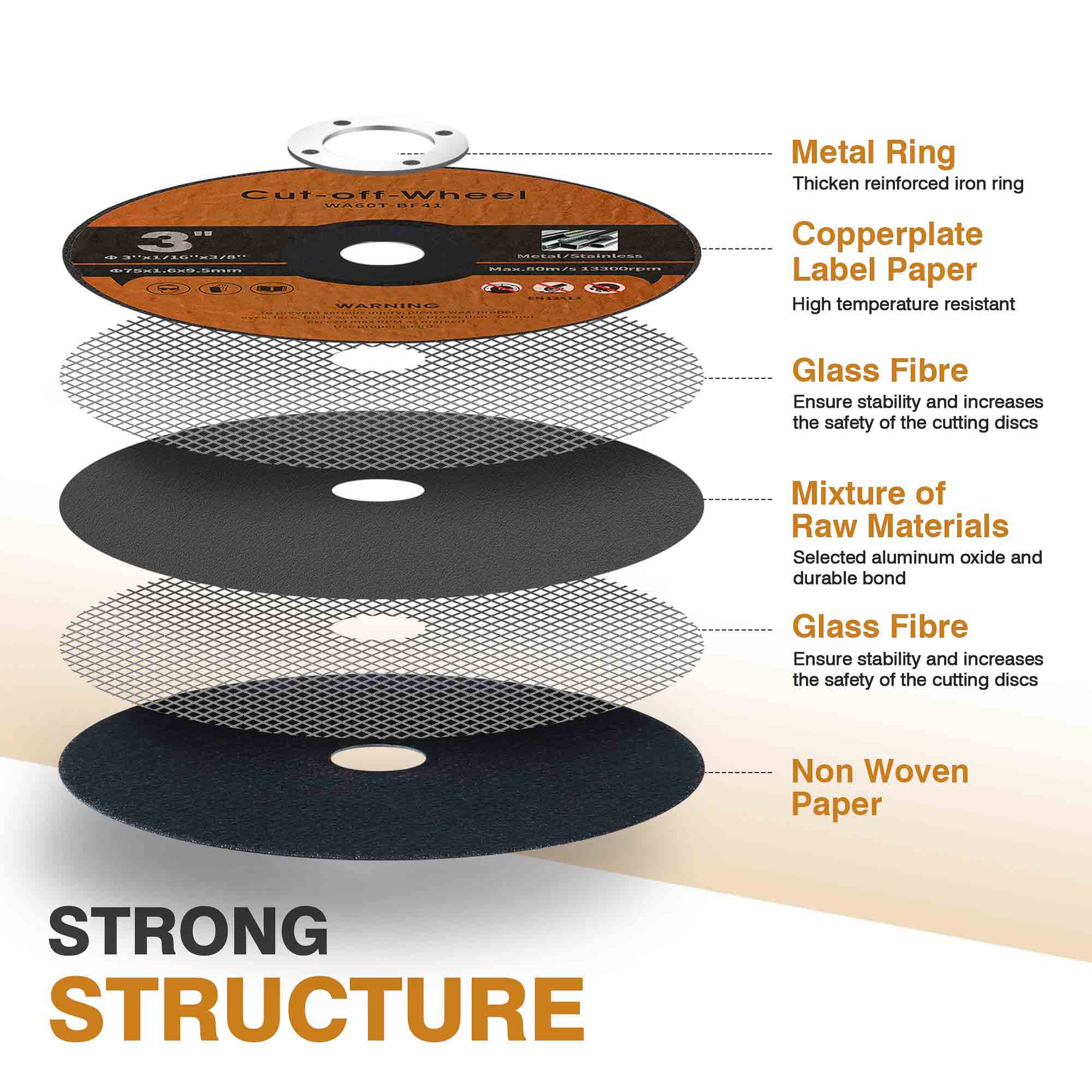 Nucleul de plasă din fibră de sticlă cu două straturi oferă: rezistență la lacrimă la 360 ° în timpul funcționării RPM ridicate, protecție rezistentă la explozie sub sarcini grele, amortizare a vibrațiilor pentru tăieturi mai netede, integritate structurală chiar și la viteze maxime de funcționare.